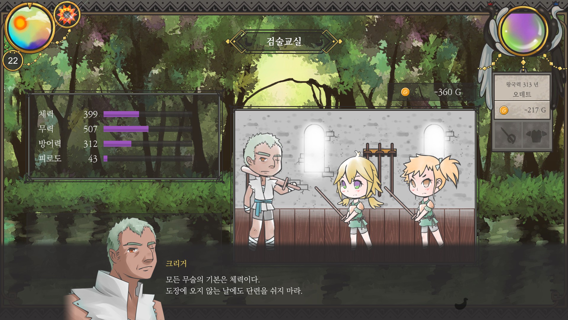 7. 40일 대회 전까지 알바비 검술교실에 쓰면서 무력 최대치까지 올리기 (지력알바가 무력을 까긴 하는데 그거 상쇄하러 검술 자주 가면 체력이 더 올라서 좋음)