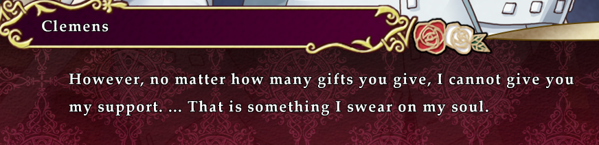 클레멘스는 지력 덕에 결투도 안 받아주고 선물공세도 효과가 없고