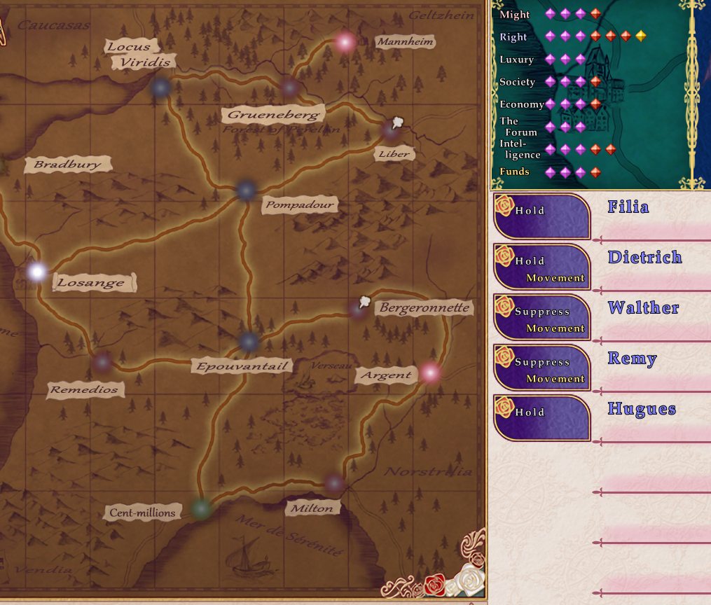 1) 노말모드로 해서 디트리시 이벤 자동진행 + 왕도를 올리기 위한 공작은 루시앙 영지/추방시킬 영지에만